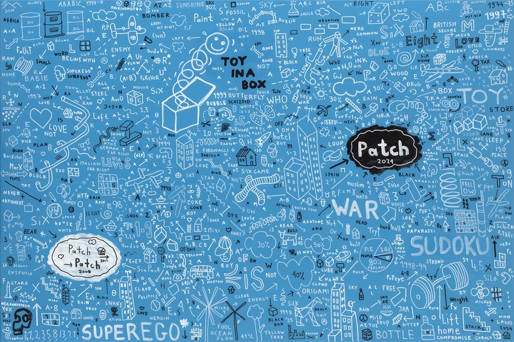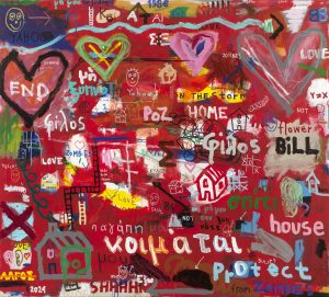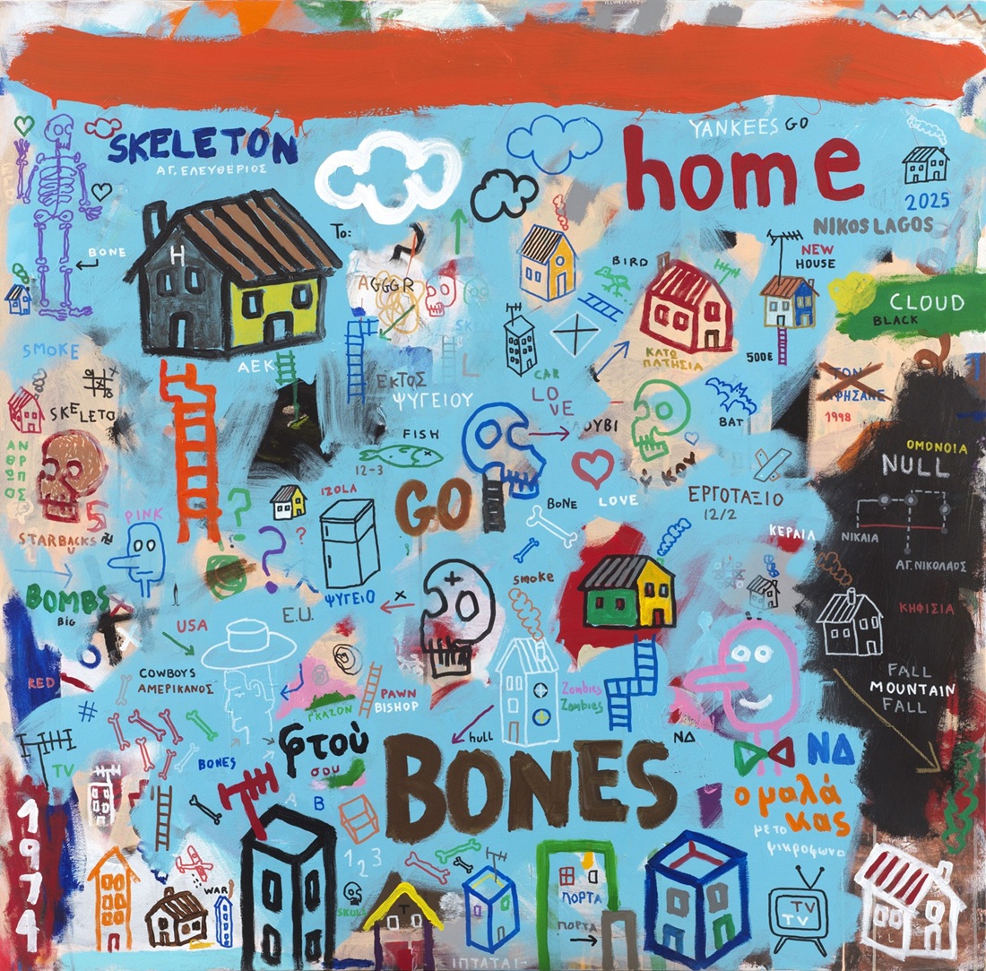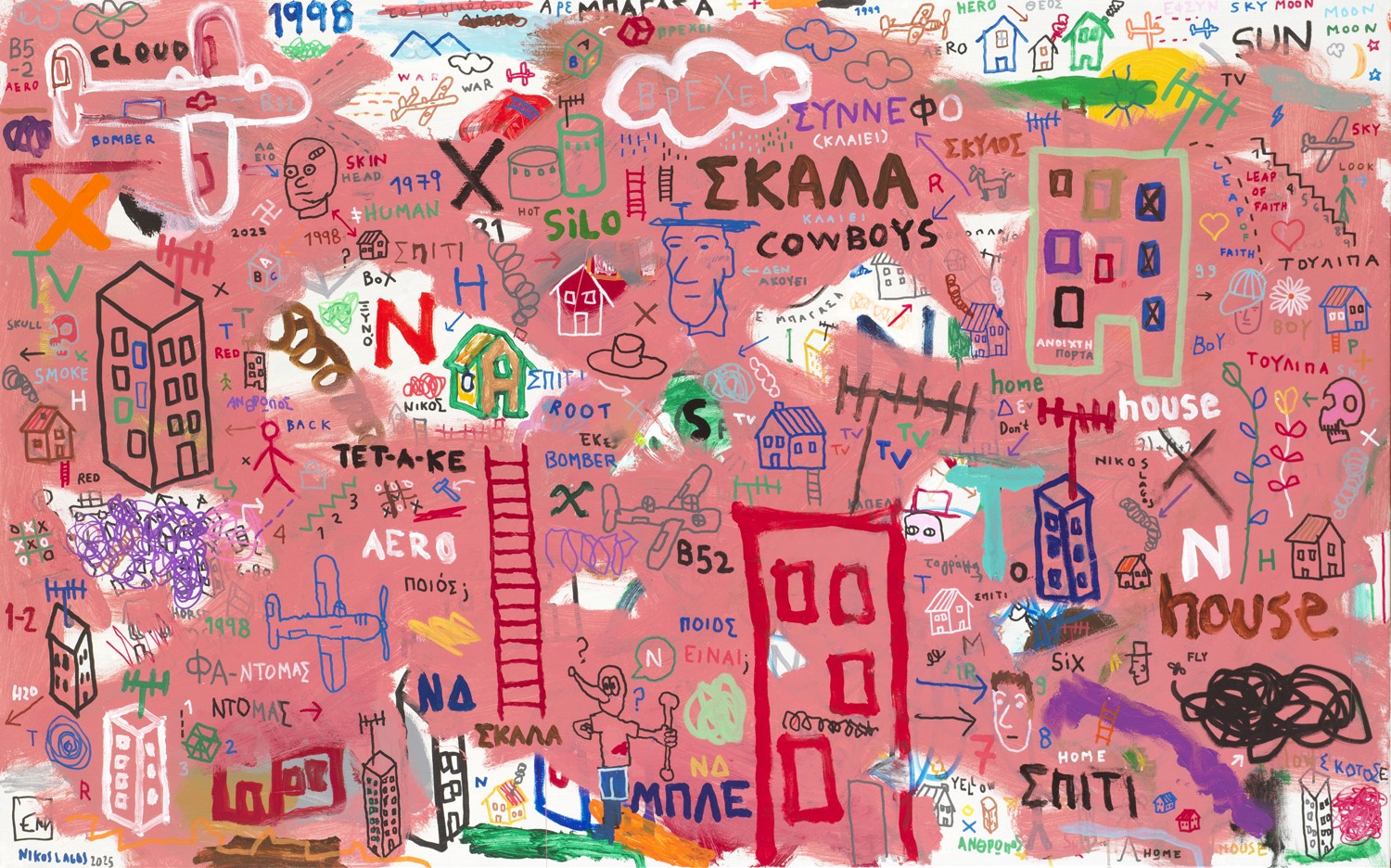 Christoforos Marinos mentions in the catalogue that accompanies the exhibition: “Lagos paints (his) thoughts, whether they are negative or positive, dark or happy – and this explosive juxtaposition adds power and unique qualities to his canvasses… The space in Lagos’s painting seems like a riddle as it is formed like an amusing game for children: such as the ‘noughts and crosses’ that often appear in his paintings, or the ‘hangman’ where the viewers-players try to guess the hidden words. It is an ambiguous game that is constructed and deconstructed simultaneously and perpetually”.